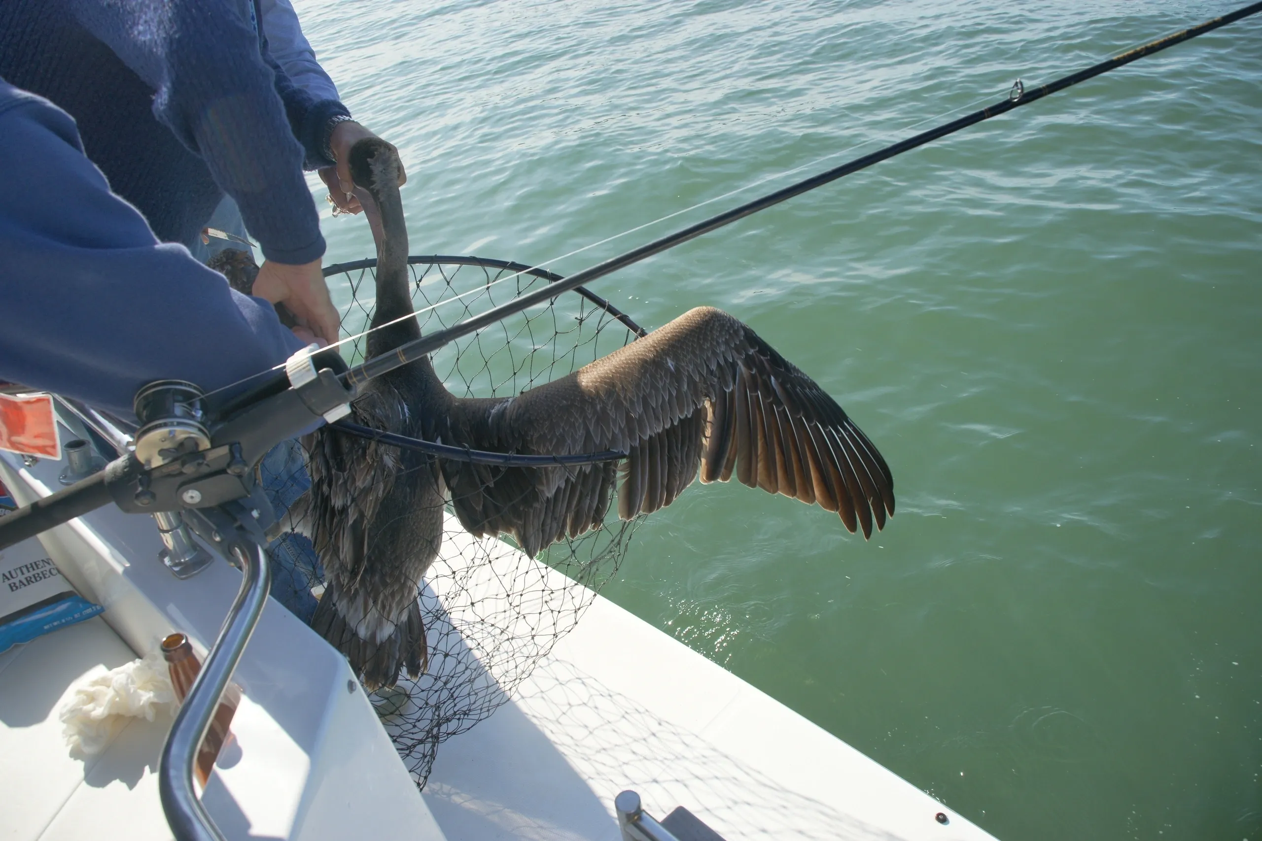 We stopped the boat and used the fishing net to haul the pelican on to the boat. The pelican either very tired or instinctively realized it may be saved, did not fight and let us do what ever with it.