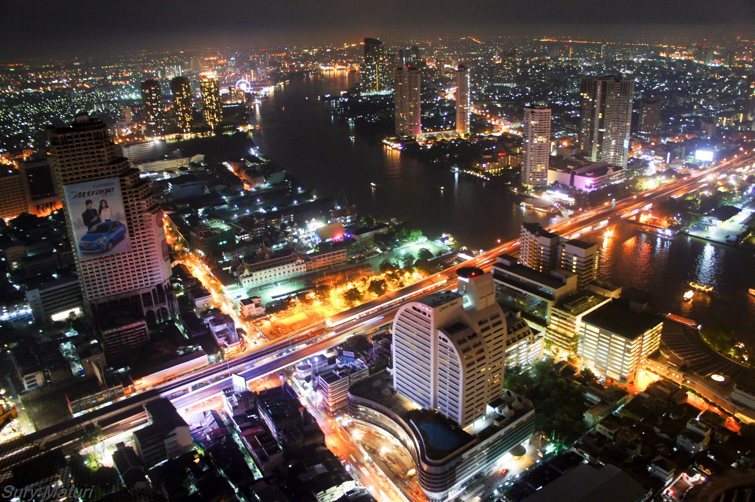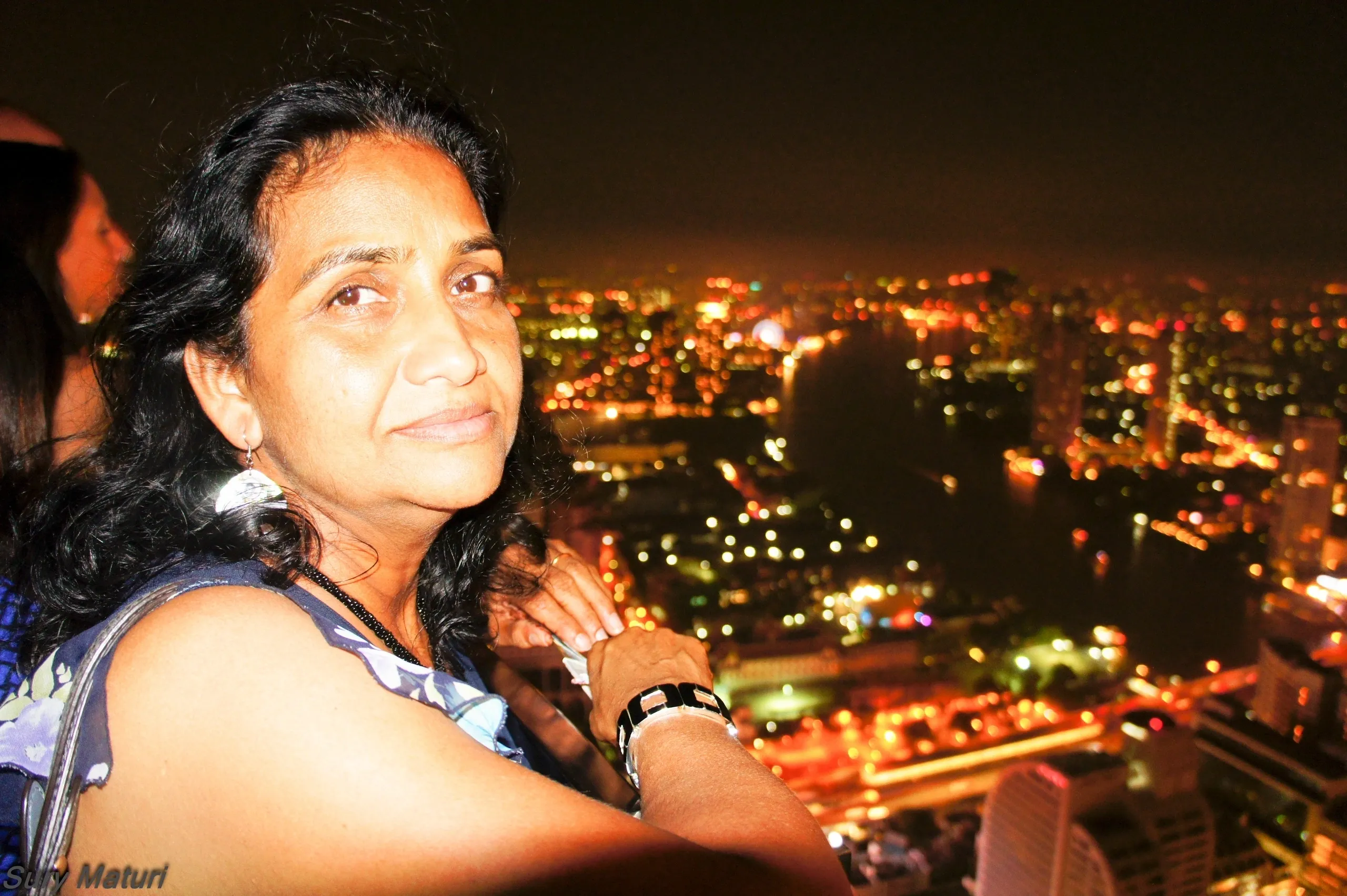 As I was experimenting, I saw a young German couple standing next to me and the gent was trying in vain to get an image similar to the one below with his companion, but only managed to get the one like the one above, with city lights barely visible. Since I was still ailing with my “affliction” at that time :D, I asked him to give me his camera and set him up with rear sync flash setting on his Nikon, IIRC, and voila!!! He was happy. If they were to go through their album now, I know there is a happy camper somewhere in Germany or where ever he is now, who was glad that I volunteered to give him (or forced upon him) an impromptu photography class on a crowded roof top bar at 820 above the street level.