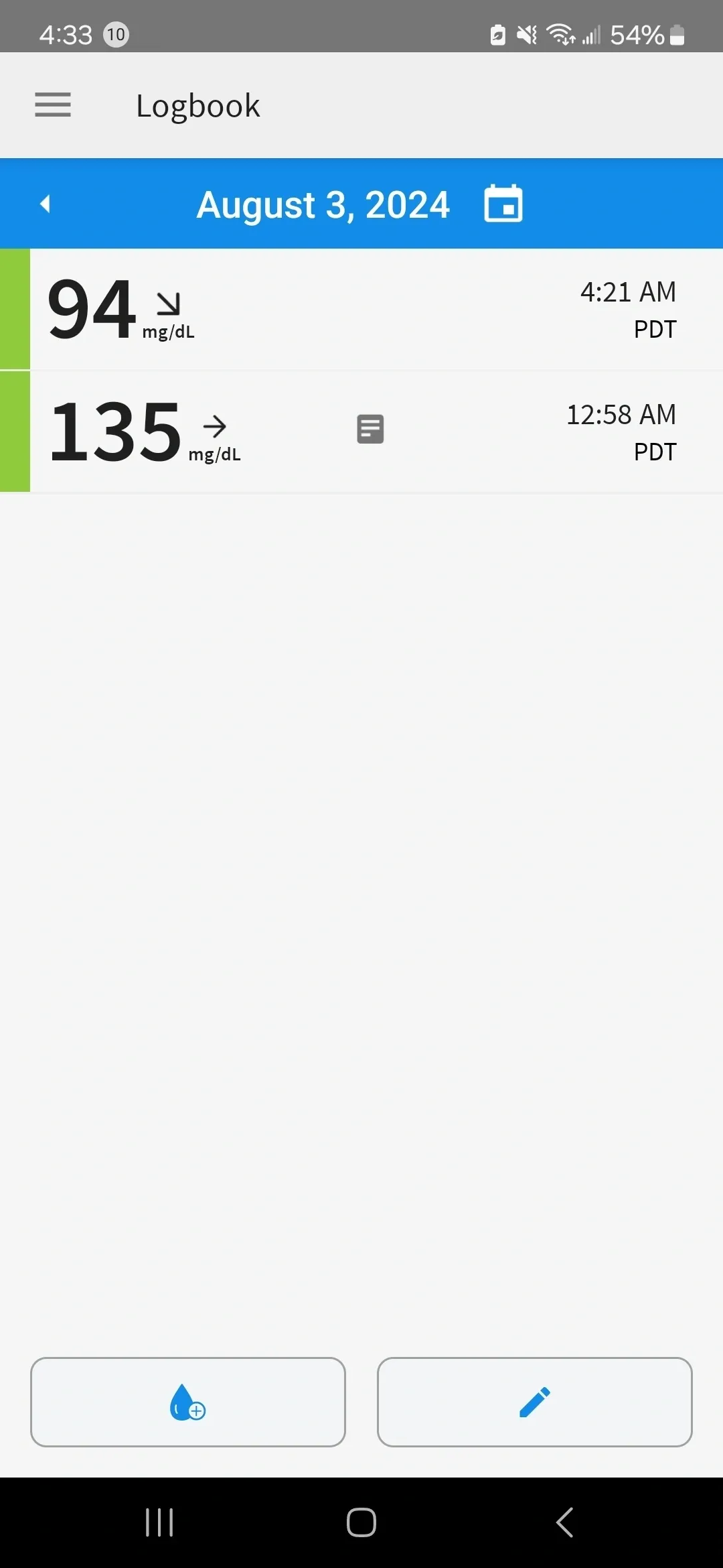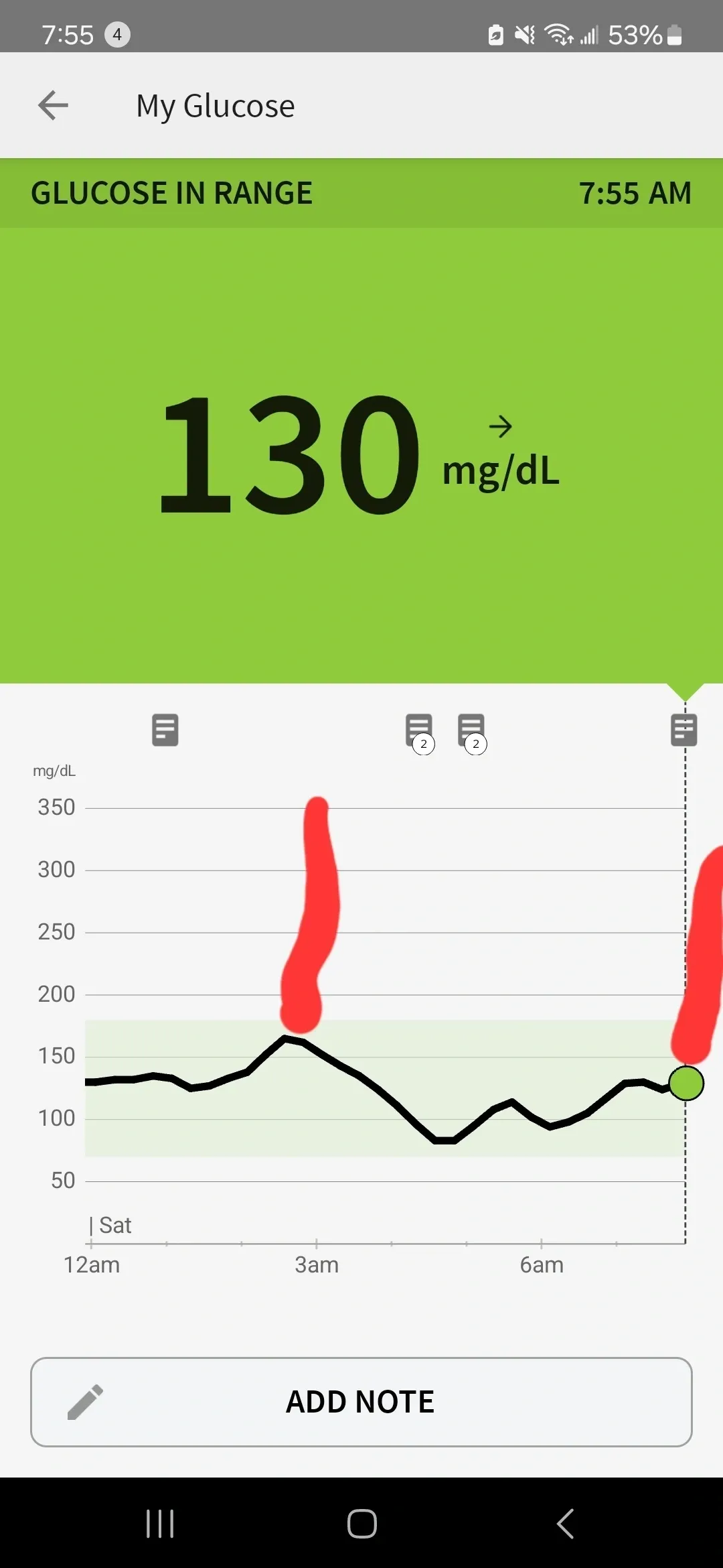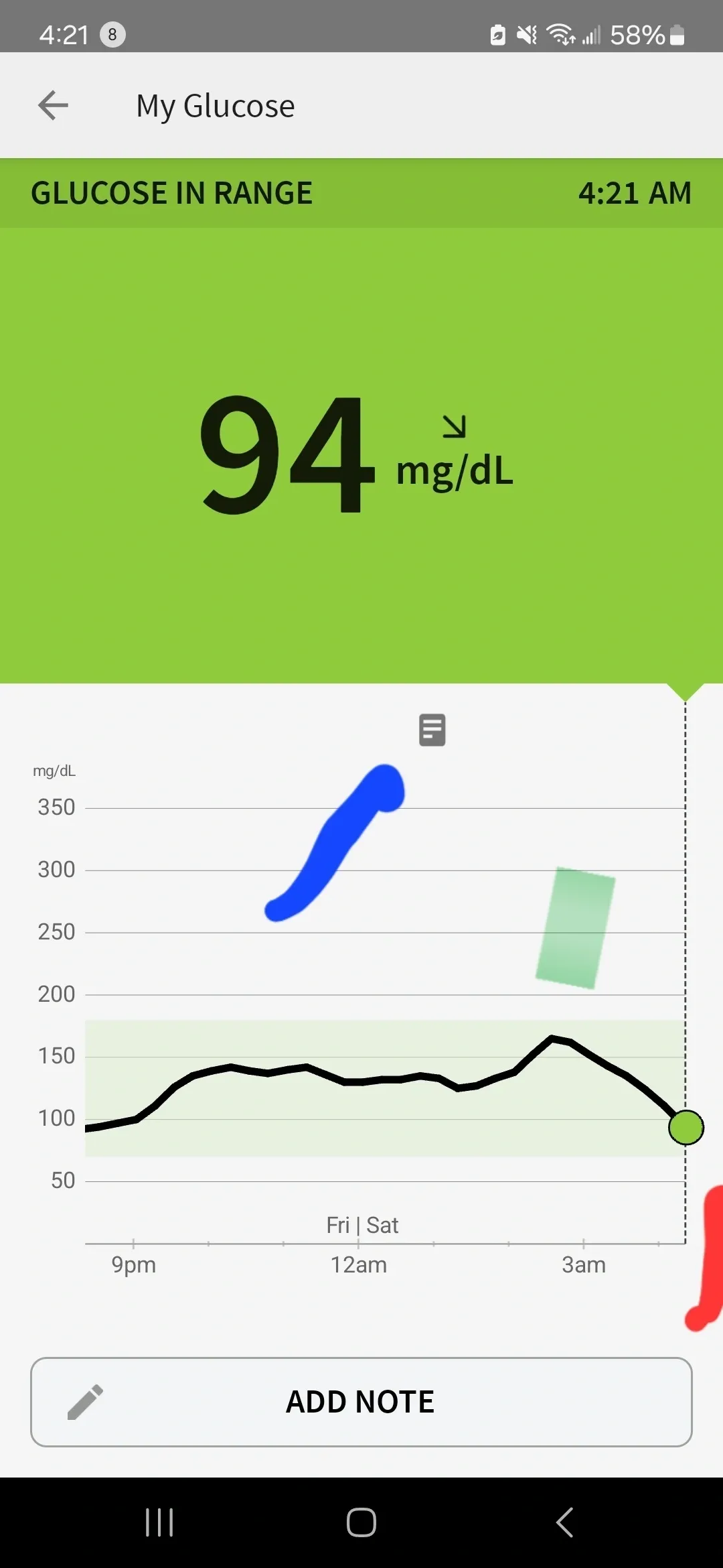 I went to bed around 1 AM which is my normal bedtime and woke up around 4.20 AM feeling the symptoms of approaching hypoglycemia. Thanks to my GCM, my feelings are quantified. You can see the trendline arrow showing a rapid decline of my blood sugar.